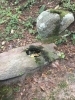 しばらく登っていくと、今度は石段が出てきました。その横には、昔、手水場として使われていたと思われる岩と、ポコッと空いた穴が。